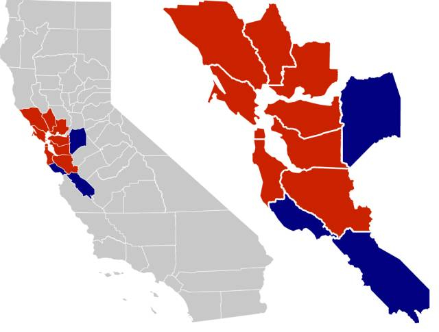 图表来源:Wikipedia,红色区域为湾区主要涵括的九个郡,包含蓝色在内的十二个郡是综合统计都市圈(CSA)常作为旧金山湾区都市圈的统计口径使用。