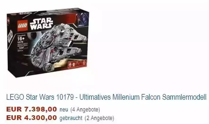 2007 年发售的终极收藏版‘千年隼’号,当时售价 499.99 美元,前几年在德国亚马逊上拍出了 7398 欧的价格,足足涨了 14 倍。