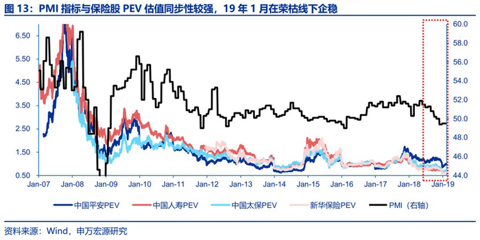 PMI作为宏观经济的领先指标领先长端利率走势约1个季度,对保险股估值引导作用将强于长端利率。