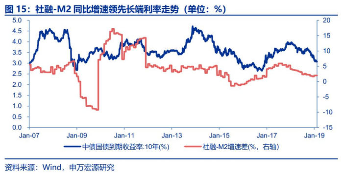 M2,从银行负债端展示传统间接融资渠道释放的货币量,社融则从实体企业的负债端考量金融对实体的支持力度。在统计范畴上,社融分项和派生M2分项存在较多重叠,两者主要差异在于,派生M2分项包括外汇占款变动,财政投放,银行投放非银,而社融包括直接融资(企业债券和股票融资),表外融资(未贴现的银行承兑汇票和信托贷款)以及外币贷款。M2,可以看做是货币的供给,社融可以看做是货币的需求,理论上社融与M2的相对缺口越大则对应较高的利率水平。社融可看做货币的总需求,而M2则是货币的总供给,因此社融同比与M2同比的差异越大,说明信用主体对货币的需求就越旺盛,因此对应更高的利率水平,即社融同比-M2同比差值与利率水平正相关。从历史回溯来看,社融-M2增速差对长端利率走势具有一定领先参考意义。