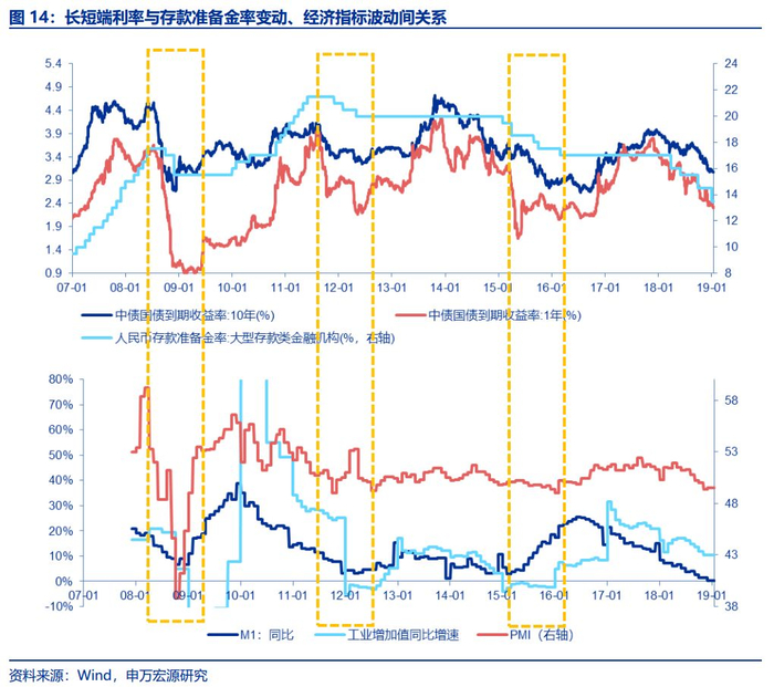 我们发现央行历次“连续降准”的末期往往迎来M1同比增速的底部拐点,领先工业增加值、PMI指标,并逐步拉动长端利率向上(时间为1-3个季度)。