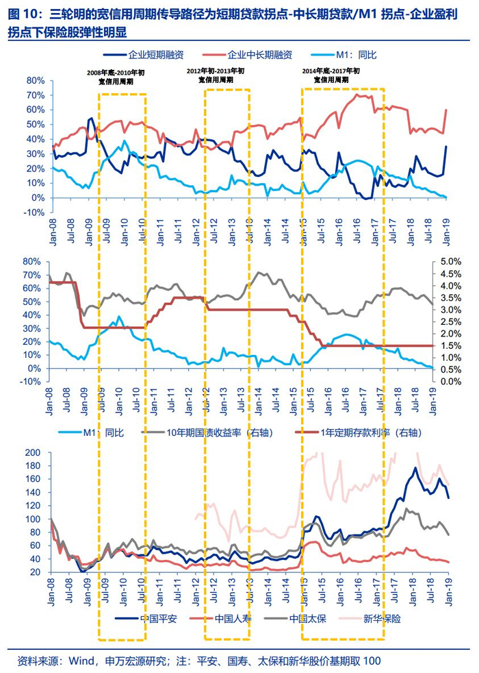 2008年底-2010年初:08年12月短期贷款占比率先反弹向上,2-3个月后M1和中长期贷款先后回升,PMI同步于M1反弹,工业增加值滞后3个月增速开始修复,本来宽信用传导时滞最短。保险股中,平安(+112.0%)、太保(+126.5%)和国寿(+45.8%)涨幅明显,同期10年期国债收益率同步于M1增速的拐点,从2.8%向上修复至3.5%。
