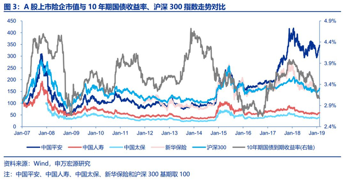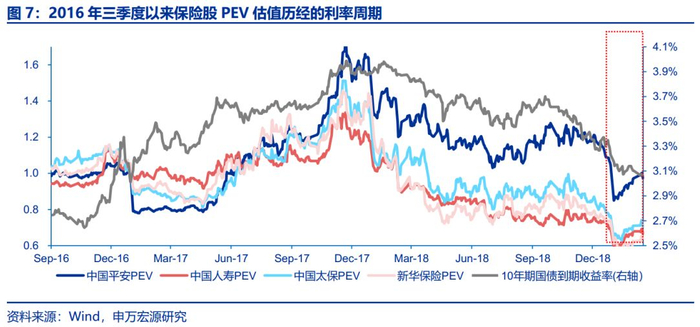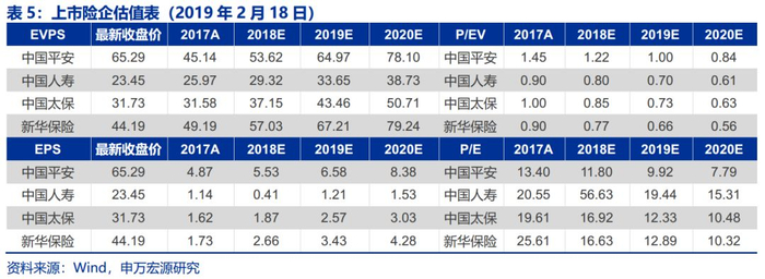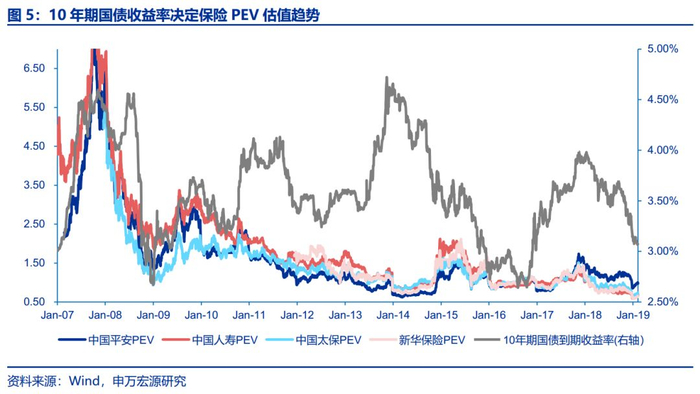 步入2018年,1月股市开门红,2月中美贸易摩擦升级,权益市场高位震荡下行,市场避险情绪升温,叠加保险“开门红”数据惨淡大幅低于市场预期,保险板块估值历经“戴维斯”双杀。1Q18,10年期国债收益率下行14.0个bps,沪深300下跌3.3%,平安、国寿、太保和新华分别下跌6.7%、16.6%、18.1%和34.4%;二季度,市场避险情绪进一步升温,央行货币政策逐步有6月披露的5月社会融资规模数据出现断崖式下跌。与此同时,美国正式决定对中国500亿美元的进口额征收25%的关税,国内经济发生多重风险暴露,6月末央行货币政策报告中2017年四季度的“实施好稳健中性的货币政策,切实管住货币供给总闸门”改成了“稳健的货币政策保持中性,要松紧适度,管好货币供给总闸门”,政策开始微调。2Q18,10年期国债收益率下行26.5个bps,沪深300指数下跌9.9%,平安、国寿、太保和新华分别下跌8.6%、9.9%、6.1%和6.8%。8、9月份,地方债集中供给,采用“同期国债+40bps”的定价方式发行,同期供给侧成本上升推动CPI上扬,市场出现“滞胀”的担忧,对利率债的走势形成干扰,3Q18,10年期国债收益率上行14.0个bps,沪深300指数下跌2.1%,保险开启估值修复,平安、国寿、太保和新华分别上涨18.1%、0.7%、14.2%和19.1%,年内调整较大的新华反弹强劲。四季度以来,中美贸易摩擦升级,央行定向降准,12月通胀和PMI双双低于预期,拖累长端利率继续探底。4Q18,10年期国债收益率下行38.4个bps,沪深300指数重挫12.5%,保险创出年内新低,平安、国寿、太保和新华分别下跌18.1%、10.1%、19.9%和16.3%,对应2018年PEV估值分别为1.05X、0.70X、0.77X和0.74X。