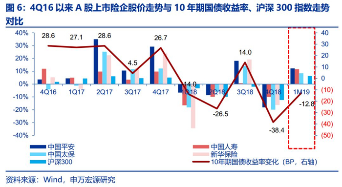 步入2019年,长端利率下行趋势确立,但幅度和节奏市场分歧较大。1月10年期国债收益率下行12.8个bps,权益市场受政策红利催化上涨6.3%,1M19平安、国寿、太保和新华涨跌幅分别为+12.3%、+11.6%、+8.4%和-0.3%,略超市场预期。