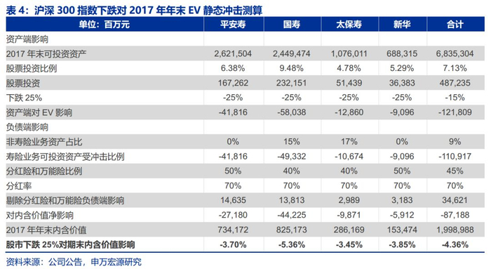 4.2权益市场冲击测算:沪深300指数下跌25%,对4家上市险企合计EV冲击4.36%