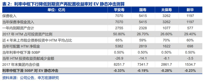 我们首先进行利率中枢下行降低到期资产再配置收益率对EV静态冲击测算,2018年新配置资产来源两部分: 当年原保费收入以及2018年当年到期的可投资资产(根据2017年年报附注获取),再结合上市险企债券投资中HTM占比计算当年利率中枢下滑50BP对EV的冲击,结果显示对平安、国寿、太保和新华2017年末内含价值影响的静态冲击为-0.33%、-0.19%、-0.28%和-0.23%。