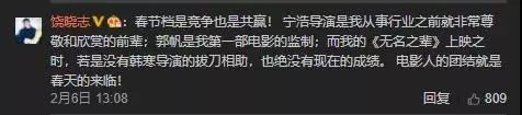 春节档是竞争也是共赢! 宁浩导演是我从事行业之前就非常尊敬和欣赏的前辈;郭帆是我第一部电影的监制;而我的《无名之辈》上映之时,若是没有韩寒导演的拔刀相助,也绝没有现在的成绩。  电影人的团结就是春天的来临!