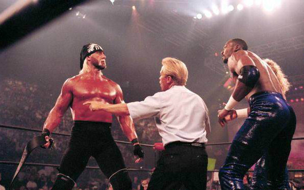 霍根(左)还曾经和NBA的卡尔·马龙(右),丹尼斯·罗德曼进行过摔角表演赛。