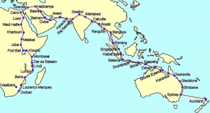 航线从奥克兰出发经过悉尼,沿着传统的袋鼠航线抵达开罗,再向南沿着非洲航线纵贯非洲,最终抵达南非的德班港。邮件在德班港上船,经海路沿着非洲西岸前往英国南安普顿。真是家书抵万金啊!