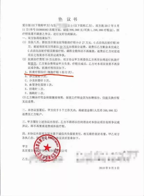 爱尔丽与消费者签订的退款协议也显示做了活体细胞治疗。