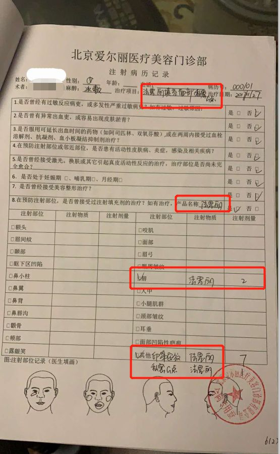 在苏梅一再要求下,北京爱尔丽的工作人员为其复印了病历,在“注射病历记录”中,治疗项目被标注为“法思丽填充面部”,注射部位被标注为“唇、印第安纹”,注射的物质全部是法思丽。