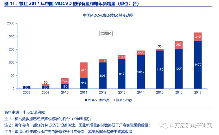 从芯片企业的CAPEX支出情况来看,MOCVD作为LED最核心环节的外延片生长关键设备,也是制造环节中单项投资最大的设备。现阶段一台VECCO设备的价格约在150万-200万美元之间,购置成本约占整个LED生产线成本的50%左右,同样购买一台中微的机台,价格约便宜20%。