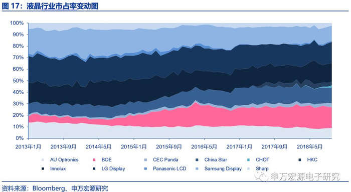 从面板行业发展角度来看,在技术迭代未停止时,三星和友达都曾经成为市场的龙头而攫取了大部分利润,在2010年后技术迭代停止以后,从2013-2018年以后,整个行业的市占率并未出现特别显著集中的变化,主要玩家集中在9-11个手中,供给端的竞争从技术、规模竞争走向了资本竞争的方式(大陆地区面板行业的参与者,背后资金支持是很重要的角色)。可以预见短期面板行业很难出现1-2家公司占据80%以上的格局。