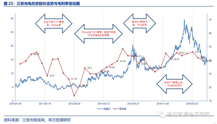 2014Q1-2018 Q3 三安光电的季度营收基本稳定增长,增速稳定。归母净利润波动趋势较大,整体来看呈现较快增速。2016 Q1由于2015年的大降价导致销量较低,这也成为了这两年LED行业的拐点。2016 年二季度以来,三安光电营收和归母净利润不断增长。2018 Q3 总营收22.20 亿,同比增长0.19%,归母净利润7.41 亿元,同比增长-14.14%,单季营收和归母净利润平稳增长。
