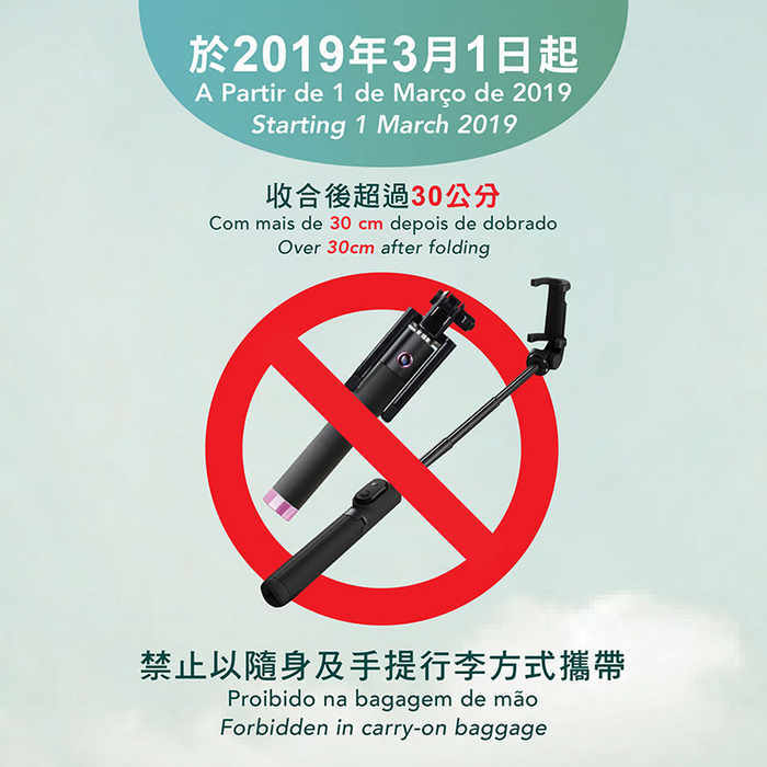 同时,自2019年3月1日起,澳门国际机场和直升机机场也将禁止乘客以随身或手提行李等方式携带收合后超过三十厘米的自拍杆、相机/录像机三脚架和单脚架。收合后长度超过三十厘米以上的物品必须以托运行李方式运输。