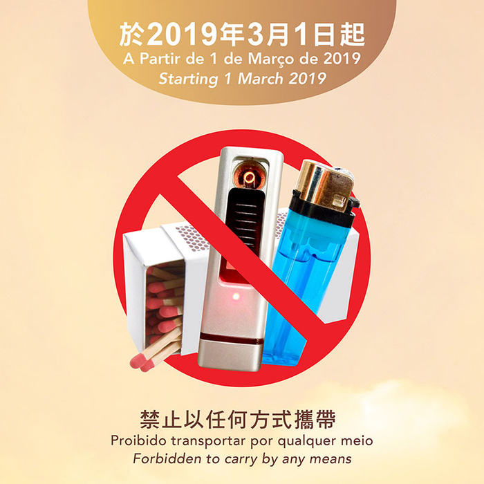 按照规定,自2019年3月1日起,澳门国际机场和直升机机场将禁止乘客以任何方式携带打火机(包括火柴)。为照顾吸烟人士的需求,澳门国际机场在客运大楼禁区内的吸烟室安装了点火设备。