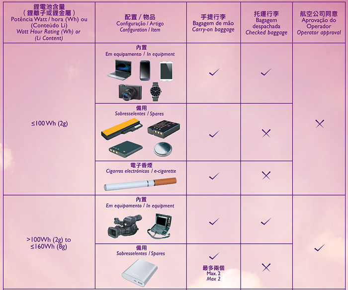 记者注意到,在澳门特别行政区民航局的规定中,对于所携带的电子产品(如手提电脑、手机、照相机、摄像机等)或便携式医疗电子仪器的锂金属含量不超过2克或锂离子电池容量不超过100瓦时,乘客可以选择把产品托运或放置在手提行李内随身携带,两者皆可。但所有备用电池必须以手提行李方式携带。因此在澳门国际机场,收合后长度超过三十厘米的自拍杆、相机/录像机三脚架和单脚架,即便含有锂电池,也可进行托运。