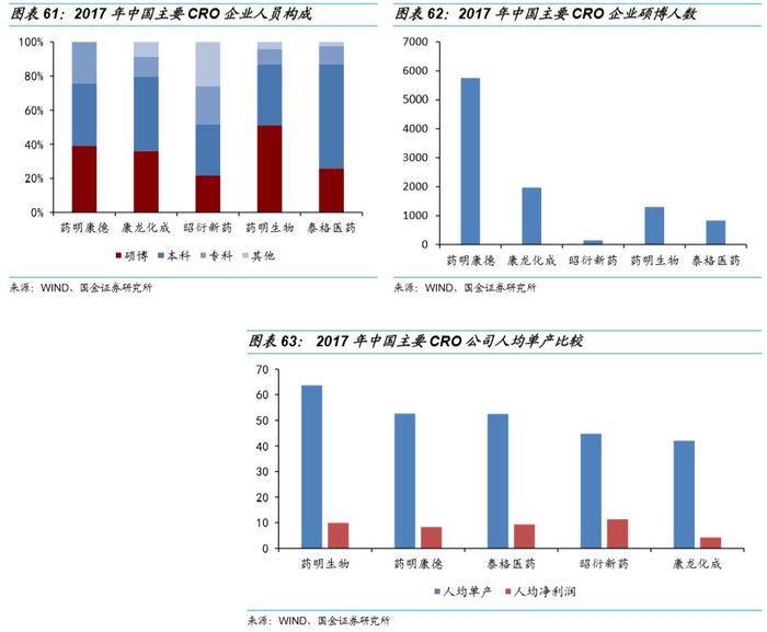 2017年中国主要CRO企业人员构成中,药明康德和药明生物硕士博士无论是占比还是绝对值均明显高于其他CRO,2017年中国主要CRO公司人均单产比较中,药明系均位居前列。
