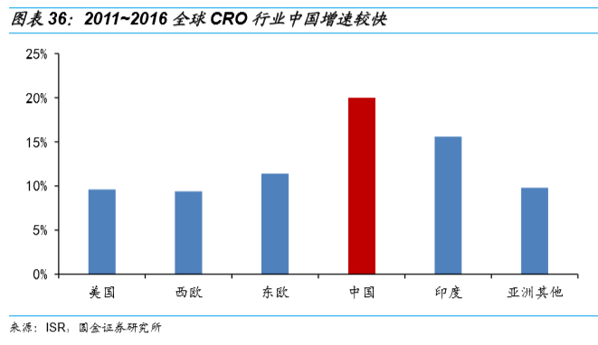根据ISR研究报告,2015-2020年,全球CRO市场仍是以欧美为主的市场,北美和欧洲的CRO行业规模占全球的81%。中国仅占2.3%,在基数较小的情况下,受益于全球CRO行业向中国的转移,将有较快的增速。