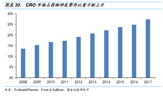 制药企业面临的问题恰是CRO企业擅长解决的问题,目前全球已有 50% 的制药企业与CRO企业合作研发新药,以加快新药上市、降低财务成本和研发风险。CRO市场占药物研发费用比重正在逐年攀升。