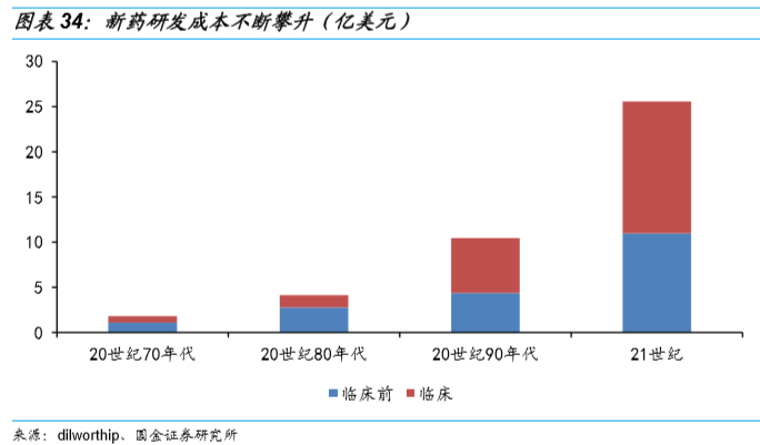 新药研发成本不断攀升:当前全球新药研发趋势日益严峻,新药筛选的难度增加,研发成本不断攀升,全球制药企业研发新药的平均成本从1975年的约1.4亿美元,上涨到2012年的15亿美元。