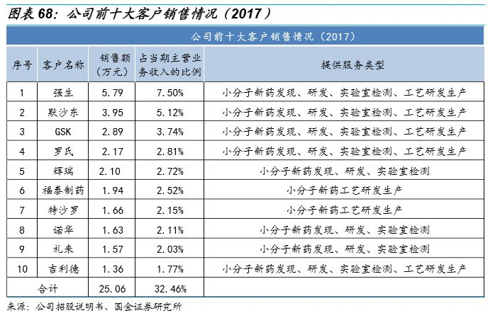公司面向国际药企提供定制化研发服务,秉承立足中国、面向国际的战略方针,在中美两地均有实体运营。多年来深耕新药研发领域,凭借对新药研发产业链条的深入了解和对新药研发趋势的前瞻判断,通过在全球范围内的一系列战略投资,整合新药研发产业链上的各项能力,致力于全面提升在产业链上下游的竞争优势,增加优势服务环节等方式实现了自有平台基础上各项业务的协同效应与快速拓展。依托于其全球广覆盖的研发基地,公司构建了强融合的全球服务网络体系,公司拥有客户数量超过3,000家,是全球顶尖小分子医药企业的长期合作伙伴,主要客户覆盖辉瑞、强生、诺华、罗氏、默沙东等全球排名前20位的顶尖大型药企及各类新药研发机构。