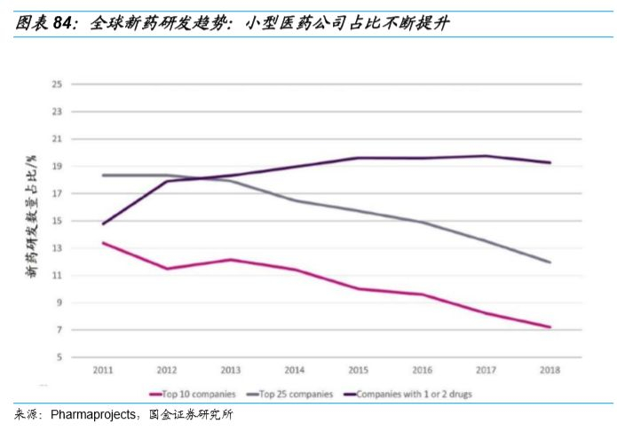近年来新药研发的一个新的趋势是,小的研发型医药企业数量不断增多。据Pharmaprojects统计,全球在研新药中新兴科技研发公司(在研管线中有1-2个新药)所研发的新药占比从2011年的14.8%左右迅速增长到2018的19.3%左右。考虑到新药销售弹性较大,新建产能周期长、折旧多等因素,轻资产的新兴生物科技研发公司往往比大型医药公司更倾向于将生产等环节进行外包。