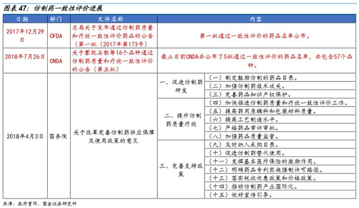 政策内容:通过质量(药学研究)和疗效(临床研究BE)的一致性评价,确定仿制药和原研药等对比品种在药效等方面一致,提升药品质量,提升行业集中度。