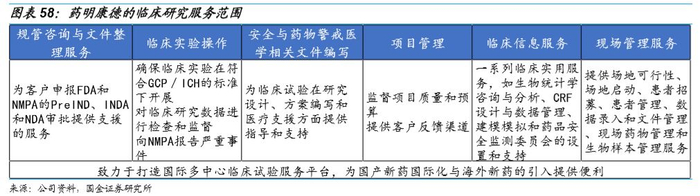 临床研究服务:重要的增长机会。药明康德的研究服务架构包括临床研发服务和现场管理组织(SMO)。临床研发服务包括项目规划、临床操作、Ⅰ期到Ⅳ期临床试验的监查和管理、结果研究以及医疗器械试验SMO部门主要提供项目管理和临床机构管理服务。