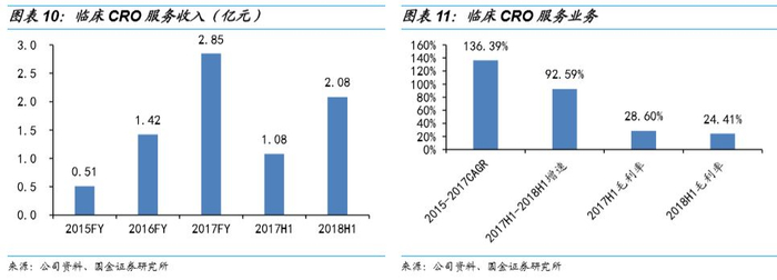 临床研究及其他CRO服务:主要包括I至IV期临床试验技术服务、数据管理、统计分析、注册申报、临床协调、CRO辅助服务。公司致力于构建国际多中心临床试验服务能力,赋能国内新药 “走出去”、海外新药“引进来”, 为客户的新药临床试验各阶段提供临床研究服务支持,包括临床试验方案设计、监察及数据分析服务、FDA、CNDA的新药政府申报流程(CDS业务)、临床协调及现场管理服务(SMO服务)等。公司现 拥有超过1500位CRC,分布在全国近100个城市的600家医院提供临床中心管理服务。公司内控严格,自国家食品药品监督管理总局发布开展药物临床试验数据自查核查的公告以来,公司SMO事业部共有16个项目接受了检查,16个均顺利通过审查,其中14个获得NDA证书。2015-2017年CAGR136.39%,2018年上半年收入5.46亿元,同比增加92.59%。