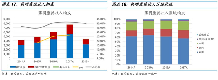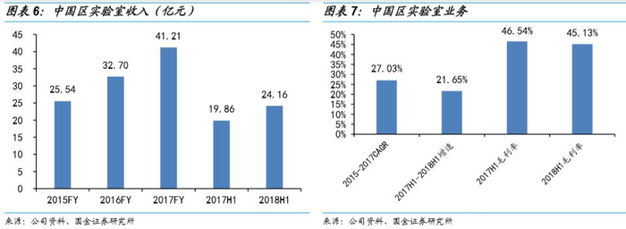 中国区实验室服务:为全球客户提供涵盖各种靶标和疾病领域的化合物发现及合成服务,包括靶标验证、活性化合物到先导化合物的发现、先导化合物优化到临床前候选药物的发现及合成服务,以及药物代谢动力学及毒理学、生物分析服务和检测服务等一系列相关业务,助力中国药企研发小分子一类新药,提供以IND申报为目标的一站式研发服务。公司是亚洲最大的临床前安全性评价平台,多次通过药监局,FDA和OECD的GLP审查,2018年上半年苏州药物安评中心再次获得OECD GLP认证。拥有全球规模最大、经验最为丰富的化学研发团队,化学家人数约6000人, 帮助客户推动重大医药产品研发进程,诸多新药获得美国FDA突破性疗法、孤儿药资格认定,及美国FDA“快车通道”等认定。2015-2017年CAGR27.03%,2018年上半年收入24.16亿元,同比增加21.65%,完成8个项目完成临床实验(IND)申报工作,占国内同类新药申报比例约为16%,累积已完成36个项目的IND申报工作。此外公司还建立了DNA编码化合物库,增强平台的新药筛选能力。