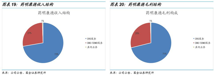从收入结构来看,药明康德收入主要由CRO服务、CMO/CDMO服务和其他业务构成,其中CRO服务的占比72%,CMO/CDMO服务占比27%。从毛利角度而言,公司的CRO服务毛利占比71%,CMO业务毛利占比28%,与收入比例接近。
