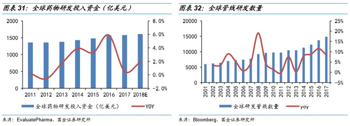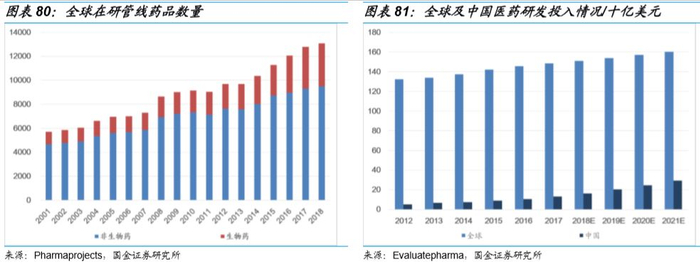 近年来,全球化学新药的研发需求(数量和研发投入)是在稳定增加的。根据Pharmaprojects统计,2001-2018年全球药品研发数量呈现快速增长的态势,尽管生物药数量大幅增长、占比持续增加,非生物药研发数量仍保持稳定的增长。从全球研发投入角度来说,随着新药研发成本的不断攀升,全球医药研发投入预计在2021 年将会达到1,600 亿美元,2016-2021 年的年复合增长率约为1.9%。其中中国医药研发行业起步较晚,但近年来取得了较快发展,具有较大提升空间,预计至2021年中国医药研发投入将达292亿美元,2016-2021年的复合增长率约为22.1%。