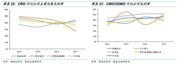 公司CRO和CMO业务毛利水平略低于同类可比上市公司,但近几年在行业平均毛利率下降的情况下,公司平均毛利率却在逆势上升。