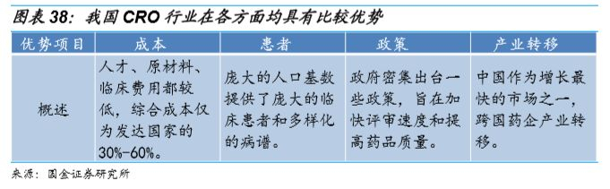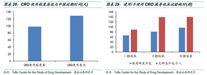CRO企业缩短研发周期,提高研发效率:使用CRO可以帮助企业缩短临床试验和申报的时间,凭借高度专业化的研究网络和新药注册团队,CRO企业可以使新药研发的资金投入和潜在风险在该行业的整条产业链上得到分散,有助于降低制药企业的研发成本及缩短平均30%的研发时间,从而加快新药审批及上市速度,获得优势的市场独占期和市场准入优势。