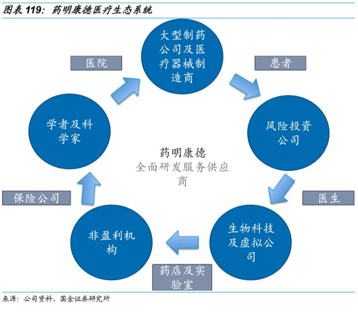 从产业链角度而言,药明康德主要针对小分子化药产业链的研发环节和生产环节提供药品合同研发服务(Contract Research Organization, CRO)和合同生产服务(Contract Development Manufacture Organization,CDMO)。主要业务板块包括中国区CRO服务、美国区CRO服务和小分子CMO/CDMO。药明康德从创新药研发的早期即介入其中,与客户在创新药研发的整个生命周期中保持合作,形成了深度的战略合作伙伴关系。在药品进入商业化生产阶段后,为了保障药品的质量稳定性以及持续、可靠供应,客户会倾向于延续之前的合作关系,提高了公司获得CMO/CDMO生产订单的机会。通过此种模式,公司与客户最终形成稳定可靠的长期战略伙伴关系,促进公司业务的持续、稳定增长。