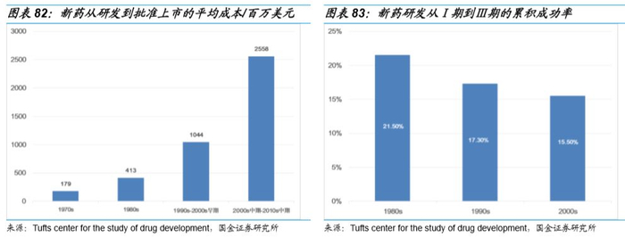 近几十年来,新药研发成本持续上升,研发难度加大、研发周期延长、研发成功率不断降低。上世纪70年代至今,单个新药研发费用从1.79亿美元增加到了25.58亿美元,但是累计成功率呈现下降的趋势,从21.5%下降到了15.5%。