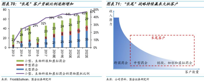 目前在为3300多个客户服务,其中很大一部分是初创和生物科技公司。五年以前,药明康德开始打造“长尾战略”,与中小型药企,创投、初创和虚拟药企广泛接触,给大量的初创公司赋能预计到2022年,“长尾”客户贡献比例有望增加到47%。与头部跨国药企大客户相比,“长尾”端更容易催生具有颠覆性的产品和重磅炸弹。随着药明覆盖的长尾客户越来越广,长尾客户中产生重磅炸弹药品的概率就越来越大,因此我们预计未来这部分有可能成为药明康德新的爆发点。