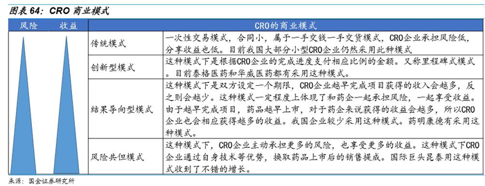我国目前大部分CRO企业还停留在传统模式,这种模式虽然风险小,但同样收益也少。一些较大企业已经普及创新型模式,并开始向结构导向型模式和风险共但模式转变,收益水平将大幅提升。