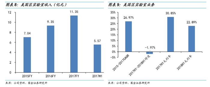 2015-2017年CAGR26.97%,2018年上半年收入5.46亿元,同比下降1.97%。美国区实验室服务收入同比下降的主要原因:一是,医疗器械检测业务因某主要客户被收购后改变检测外包策略以及去年同期一次性短期大项目完成,收入同比阶段性下降。二是,精准医疗业务处于能力建设期,固定资产投资以及人力投入大幅上升,盈利短期内有所下降,但该快业务处于快速发展期,目前为24个临床I期项目及7个临床II-III期的项目提供服务,随着细胞治疗等精准医疗项目不断推进,公司产能逐步释放和项目的增加,后续收入和利润有望加快增长。