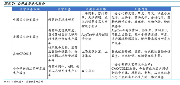 公司按照业务板块拆分可分为四块业务:中国区实验室服务、美国区实验室服务、临床研究及其他CRO服务、小分子新药工艺研发及生产CMO/CDMO业务。
