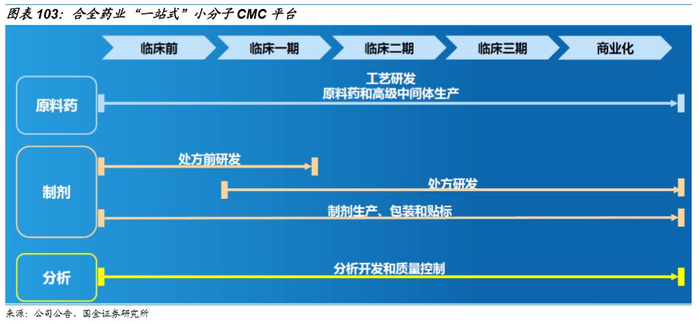 小分子新药工艺研发及生产CMO/CDMO业务:主要通过公司控股子公司合全药业进行。合全药业拥有国内规模最大、研发实力最强的工艺研发团队之一,能够为客户提供新药中间体、原料药及制剂从临床前期工艺开发直至商业化生产的一体化服务。