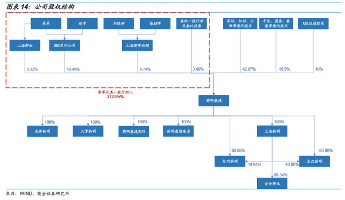 CRO 行业是医疗服务中的子行业,人在行业中发挥着至关重要的作用。公司实际控制人李革博士是药物外包行业领军人物之一,药明康德和药明生物的成功持续证明其高瞻远瞩的战略眼光和卓越的管理能力。李革博士是哥伦比亚有机化学博士,药物合成领域的全球顶尖专家。2000 年,李革博士放弃在美国已取得的成就回国创立无锡药明康德。2015 年私有化重组后药明康德在A股上市,李革夫妇及其一致行动人持股比例为 31.03%, 是公司的实际控制人。