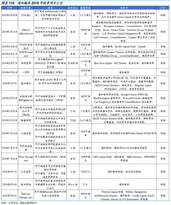 2017年5月,毓承资本和通和资本合并,合并后更名为通和毓承,由药明康德董事长、毓承资本创始合伙人李革博士担任董事长,通和资本创始管理合伙人陈连勇博士担任首席执行官。此次合并可谓强强联合,毓承资本专注于医疗健康领域,对创新型早期投资机会有独到的把握能力;通和资本在中国本土的风险投资专注更深。2018年5月4日,通和毓承投资公司UNITYBiotechnology在美国纳斯达克上市。目前已经投资70余家公司,全面覆盖创新药、器械和医疗服务等领域。目前公司管理16亿美元的4支美元基金和3支人民币基金。