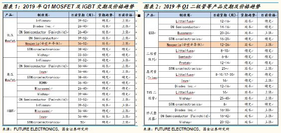 在新能源(电动汽车、光伏、风电)、变频家电、IOT设备等需求拉动下,功率半导体呈现淡季不淡的良好趋势,根据富昌电子2019年Q1市场行情报告,Mosfet、IGBT的产品交期依然普遍在30周以上,且价格有所上调。