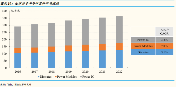 Yole预测,2016年全球功率器件市场规模约为292亿美元,预计至2022年市场规模将增长至364亿美元,2016-2022年复合增速为3.8%。其中,2022年电源管理IC市场规模约为187亿美元,2016-2022年复合增速为3.4%;功率模组市场规模约为50亿美元,复合增速为7.0%;功率分立器件市场规模约为137亿元,复合增速为3.1%。