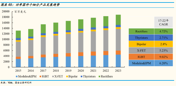 功率器件细分产品主要包括MOSFETs,功率模块,整流桥,IGBT等。根据Yole Development统计和预测,17-21年功率器件市场规模CAGR为5.39%,其中MOSFETs(5.23%),IGBT(9.02%),功率模块(6.20%),二极管(2.8%),晶闸管(2.71%),整流桥(4.72%)。