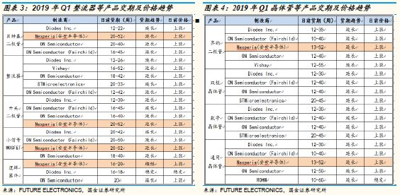 新兴需求驱动,功率半导体淡季不淡:在新能源、变频家电、IOT设备等需求拉动下,功率半导体呈现淡季不淡的良好趋势,根据富昌电子2019年Q1市场行情报告,MOSFET、IGBT的产品交期依然普遍在30周以上,且价格有所上调,其中英飞凌货期最长,达到39-52周,晶体管、二极管、逻辑器件货期也大都呈现延长的趋势,涨价趋势明显,供给紧缺情况依然严峻。