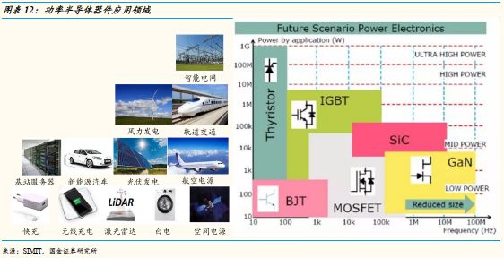 功率半导体器件可用于几乎所有的电子制造业,其下游应用非常广泛,包括新能源(风电、光伏、电动汽车)、消费电子、智能电网、轨道交通等,根据每个细分产品的物理性能不同(主要是针对高频和高功率两大性能),不同的功率器件(MOSFET、IGBT、SiC等)可以应用于不同的领域。