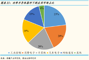 功率半导体器件按照下游应用领域,主要可以分为五大类,包括工业控制(市场占比约为23%),消费电子(20%),计算机(20%),汽车电子(18%),网络通信(15%)。